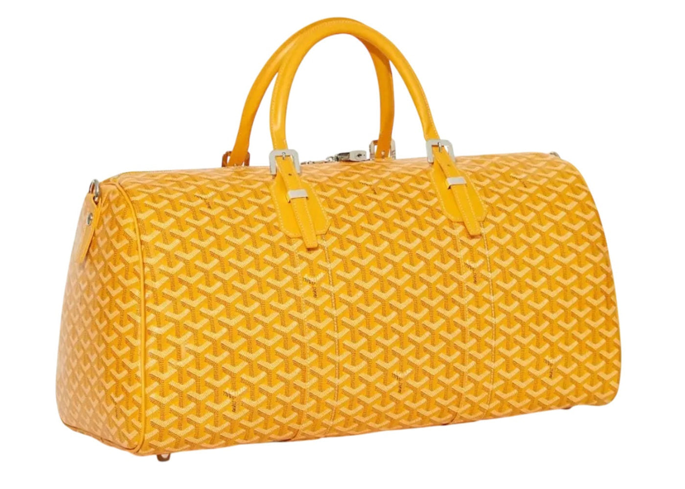 Travel in legendary style with this rare yellow Goyard Boston 50 duffle bag, featuring the house's iconic hand-painted Goyardine canvas pattern that's been turning heads since 1853. The spacious design offers ample room for weekend getaways or gym sessions, while the premium leather trim and brass hardware add that subtle flex that true connoisseurs recognize. A timeless piece that proves your carry game is as strong as your sneaker rotation.