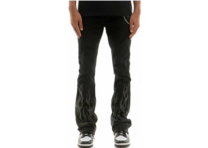 Light up the streets in these show-stopping KDNK black flame rhinestone pants. The signature flame design, crafted with precision-placed rhinestones, adds an eye-catching sparkle to the sleek black denim, while KDNK's renowned stretchy comfort ensures you can flex without restriction. These statement pants blend streetwear attitude with luxury details for those who aren't afraid to stand out.