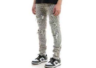 Stand out from the crowd in the KDNK KND4644 Grey Jacquard Skinny Jeans — where high-fashion texture meets street-level attitude. These jeans feature an all-over jacquard monogram pattern layered beneath heavy distressing and frayed rips, giving them a bold and rebellious vibe.