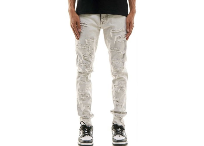 Dial up the edge with the KDNK KND4708 Ripped Skinny Jeans in Light Grey. Designed for streetwear impact, these jeans feature aggressive distressing throughout with layered rip-and-repair paneling that gives off a rugged, worn-in vibe. The light grey wash offers a clean yet gritty contrast — perfect for pairing with bold sneakers or neutral fits.