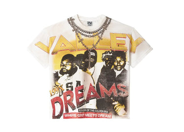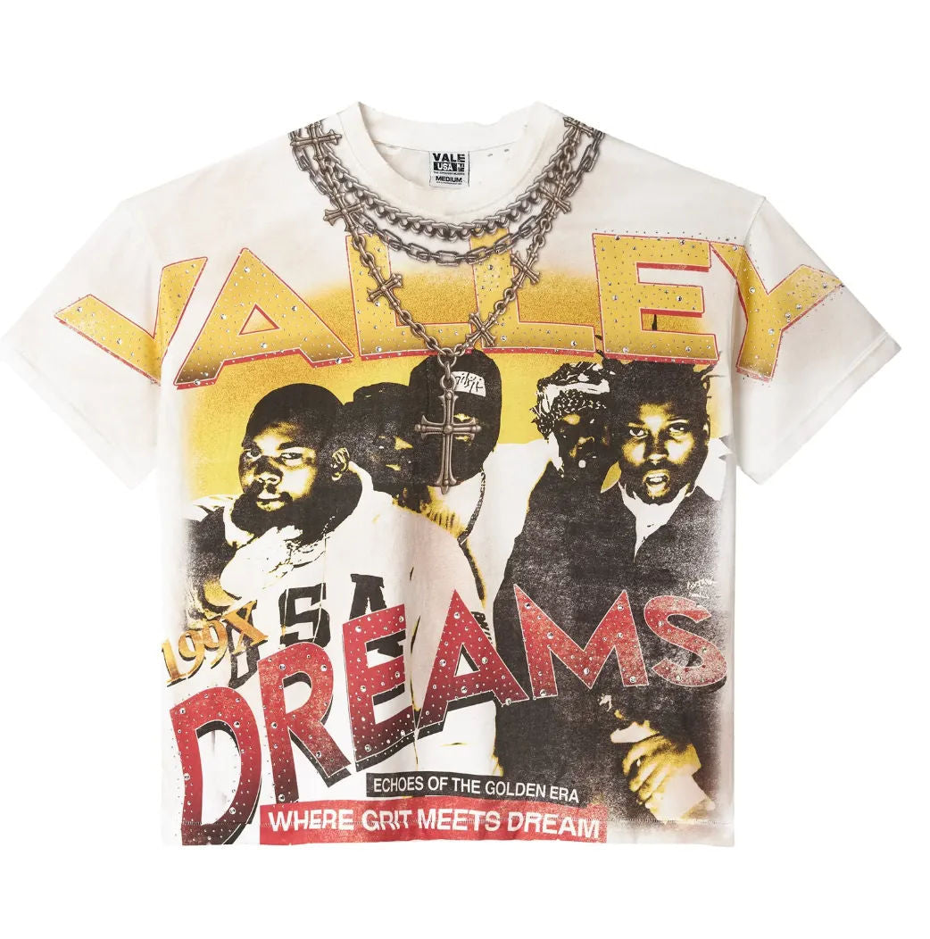 The Vale Forever Black Chambers Bling Tee celebrates hip-hop culture and streetwear artistry with a bold, graphic-heavy design. Featuring a vintage-inspired washed black base, the front showcases oversized VALLEY DREAMS lettering layered over a collage-style print of iconic figures, accented with rhinestone “bling” embellishments for a striking, elevated finish.