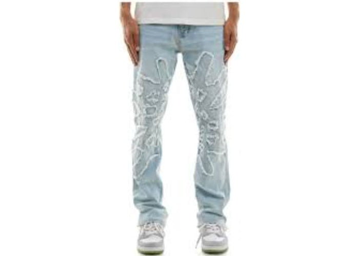 Level up your denim game with these eye-catching KDNK spider web slim jeans in light blue. Featuring an intricate distressed pattern that creates a distinctive web-like effect, these jeans offer the perfect blend of edgy streetwear aesthetics and comfortable slim fit. The premium stretch denim ensures all-day comfort while the unique wash treatment gives you that coveted lived-in look straight off the rack.