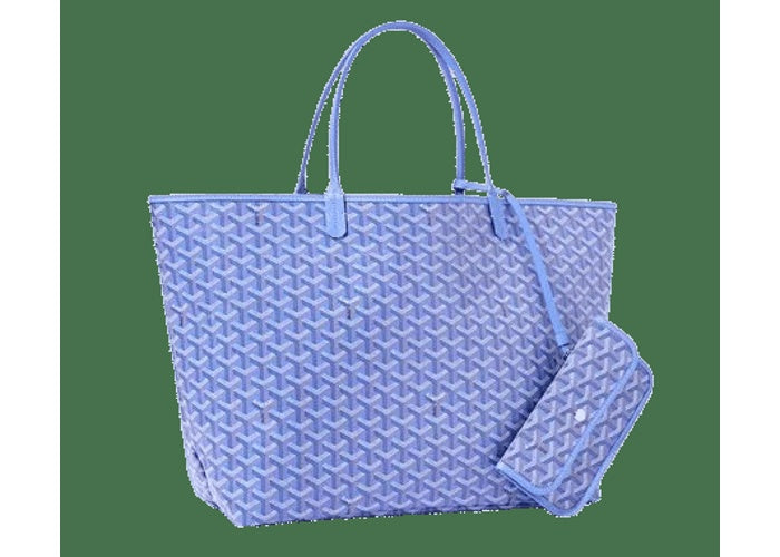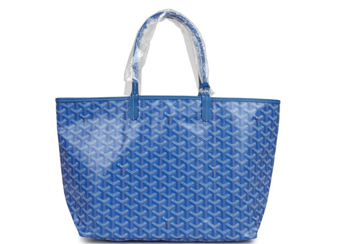 Crafted with Goyard's signature hand-painted Goyardine canvas, this Saint Louis PM tote in striking blue embodies centuries of Parisian luxury craftsmanship. The lightweight yet durable design features natural cowhide leather trim and handles, while the removable pouch adds versatile functionality to this iconic carryall. A statement piece that's equally at home flexing on the streets or jet-setting across continents.