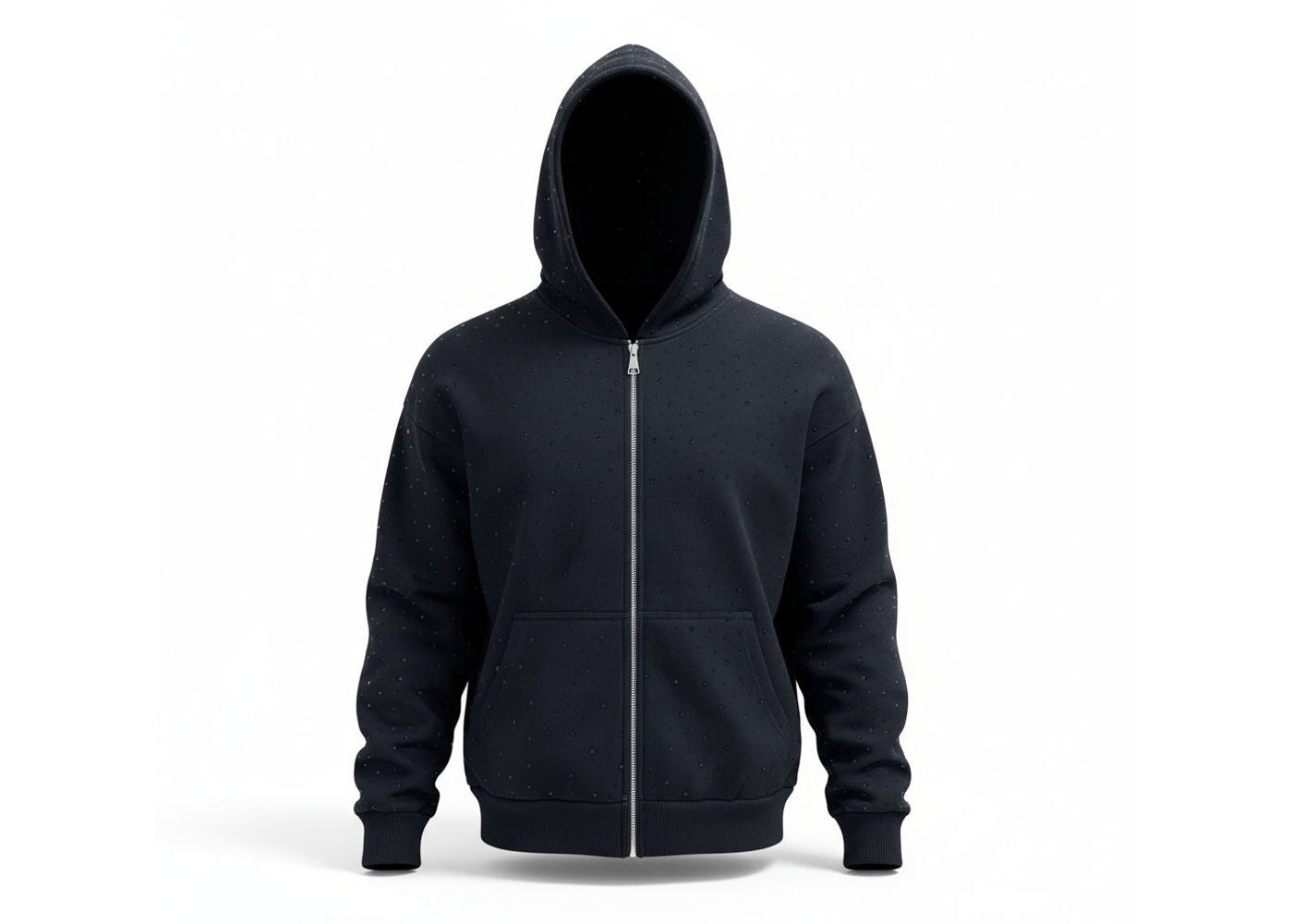 Dripping in luxury streetwear vibes, this jet black zip-up hoodie from MANI features an all-over rhinestone treatment that catches light with every move. The premium cotton blend construction delivers both comfort and durability, while the classic silhouette keeps things versatile enough for daily wear. Each crystal is precisely placed to create a stunning dimensional effect that elevates this piece from basic to bold.